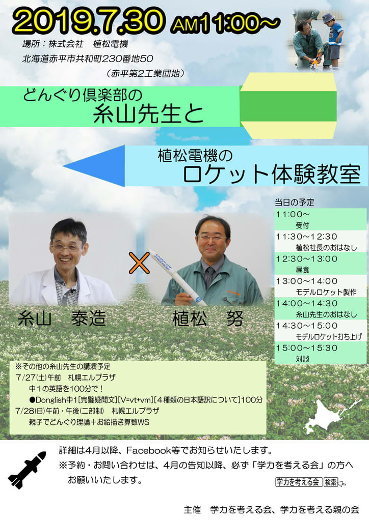 どんぐり倶楽部糸山泰造先生による北海道講演会2019決定! イベント Twitter Facebook LINE コピー 2019/2/262023/10/6 *当サイトは、アフィリエイト広告を利用しています。 どんぐり倶楽部主宰糸山泰造先生の北海道講演会の開催が決定いたしました! 詳細・お申し込みは4月までお待ちください。 一足早く告知ポスターをお披露目~。 今回はあの植松努さんとのコラボ! なんとなんと、今回の北海道講演会は、ドラマ化もされた人気小説『下町ロケット』のモデルとも言われている植松電機代表取締役 植松努さんとのコラボです。 ロケット体験教室も企画しています。 ご期待ください!